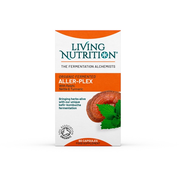 Living Nutrition Organic Fermented Aller-Plex is a blend of reishi spores, nettle, and turmeric for allergies, hay fever and immune balance.